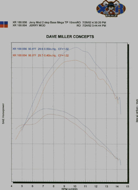 So you think we at SoCal XR's do nothing all day but play video games and shop on EBay. Well, you'd be right. However, we actually got off our duff and did something. I took my bike to Dave Miller the father of mini-bikes, along with the best tuner in the industry, and what we came up with, you can check out on the dyno chart. We started with my 123cc motor, with a 69/68 Web cam, Stock valves, 200 carb, 50/50 gas, standard Miller pipe, with just a slight clean up on the ports. This is your basic modified motor, nothing real special, in fact it wasn't faster than anybody else's' XR, faster than TTR's , But not XR's. Anyway, 59 dyno runs later, we managed to get my average motor well above average. I can't tell you what we did, or even the numbers, but you can see for yourself the results. Also, look how far it revved. Yes, that's more than 14 grand and it will go more.