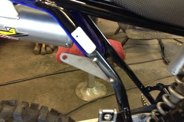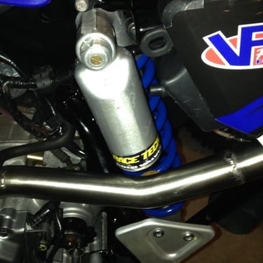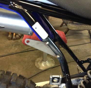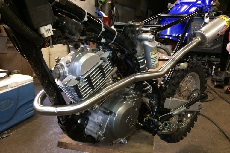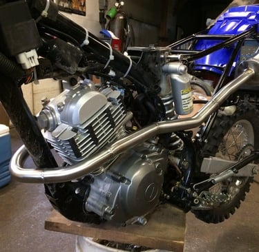 Before the motor was pulled to finish welding everything out, the exhaust needed some attention. Any exhaust for the TTR isn't designed with having to clear a shock reservoir in mind, so some cutting/welding was required. The pipe is already stepped twice, so cutting the existing welds doesn't change the appearance. Two additional cuts/welds were required in the back section.