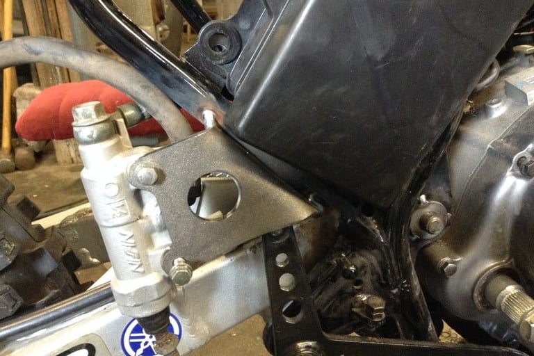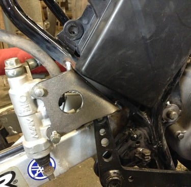 Rear brake reservoir tab. I'm planning to keep the electric start, so tucking this behind the RH number plate seemed like the best option. I'll have to trim a tab on the backside of the numberplate to fit around this, but that doesn't concern me. If a person wouldn't run E-start, the space occupied by the battery would free up, allowing for plenty of space for this.