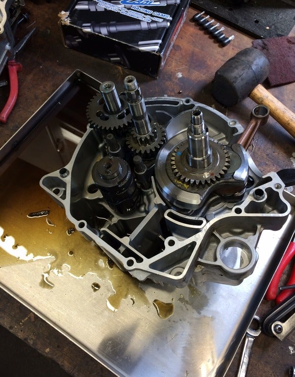 I'm not sure if I would encounter detonation issues with the higher compression on pump gas, but I threw some race fuel in it, filled it with oil, and crossed my fingers this weekend. It fired up within two seconds and idled perfectly, so that's a bit of relief. With any luck, maybe I'll have a bike together by the weekend depending on suspension...