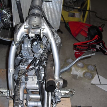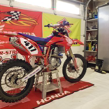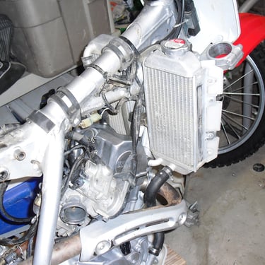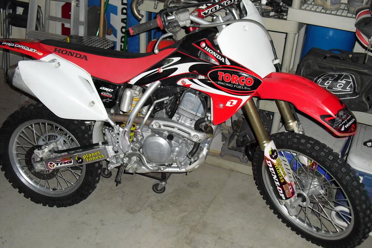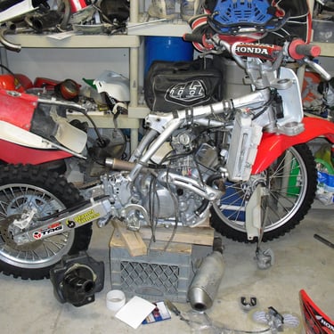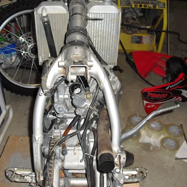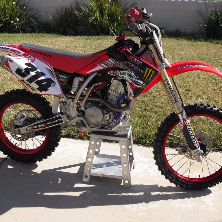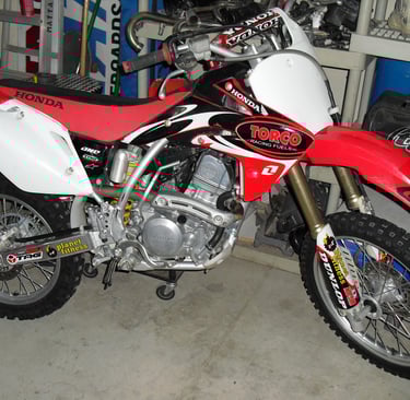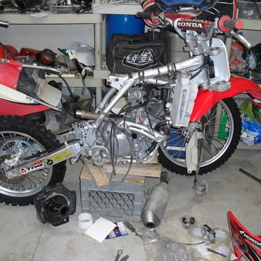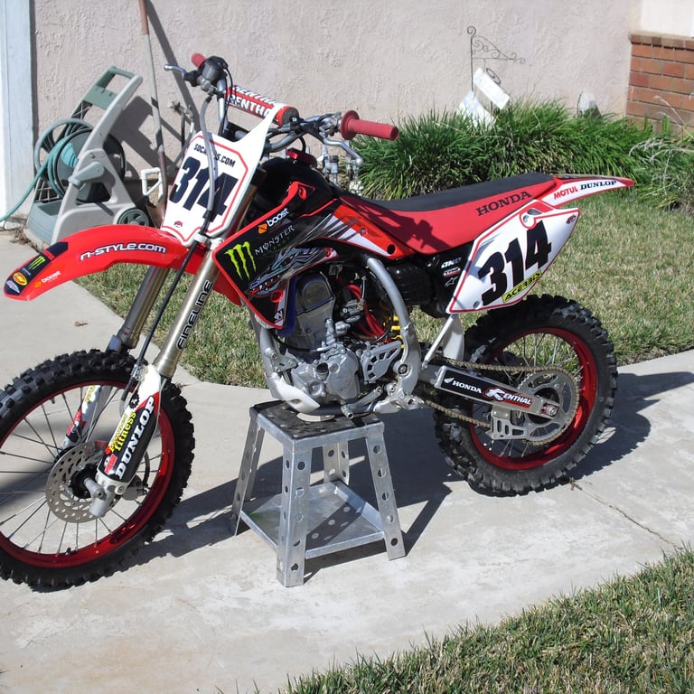 Well after blowing up my Kitaco head, valves, $25 plug, and piston, then 4 months later breaking the crank; I've given up on trying to make my little XR100 go fast. By the way, I emailed Kitaco and they said the stock flywheel is too heavy. Well, I didn't see that in the advertisements or instructions. So I picked up a used CRF150RB for a decent price and went to work on it. I'm still not finished, but pretty close. List of things: Suspension 5.8 rear spring and .40 forks springs, valved form my weight and some secrete tricks to make the forks work better, Renthal CRF mini highs, BRP clamp that move the bars out, R&D power Bowl with a 48 pilot, jetting is spot on, DMC pipe, New Bridgstones, Regina Gold chain. The Bling would be: Wheels, plastics, graphics, all hoses. Still need to install foot pegs (already had my foot hit the rear wheel ... twice), Hotcam (stage 1), A real front brake (450 twin piston caliper and steel braided line), maybe a smaller rear sprocket or bigger front. Vertex CDI