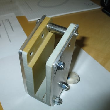 3. Cut an 8mm notch in the left side teflon where it bolts to the swingarm. A router is handy, but careful work with a file works fine. To create the 22mm inside gap, the right side teflon can be cut thinner with a bandsaw or hacksaw (use WD40), or a different combination of thicknesses of cutting board (1/4") can be used to get the same approximate dimensions.