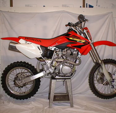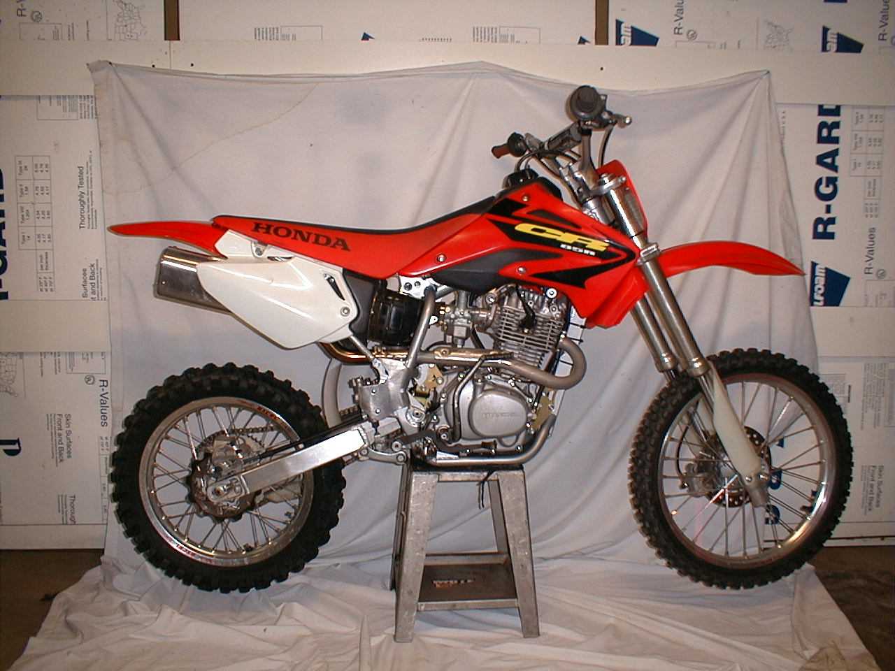 Now that I finished my conversion, I thought I would post a pic. I'm still working on the suspension. So how is it? The first thing that stands out is the power and I mean power! It can easily run with big bikes from corner to corner. I've literally pulled 125's, and can keep up with 250's. This is mainly on small to medium straights. I did ride at the Glen Helen BBR mini National and the one thing I learned is that I can't ride that track to save my life. But it did pull all other CRF150's everywhere. However I did break third gear. The big uphill, it was no problem, even from a dead stop at the bottom. The suspension is getting dialed more and more, the one problem I had was my bottom triple clamp bolts were too tight and the pinched the fork leg causing the fork to feel harsh. After I set them at 13 lbs, it's like night and day from where they were. Next after that would be the top triple clamp. Being that the frame is taller and longer than stock, it needs a triple clamp that is higher and more forward.