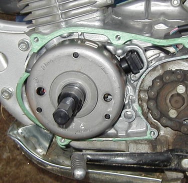 Flywheel PullerCarefully set the flywheel aside where the magnets won't pick up metal chips.