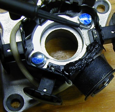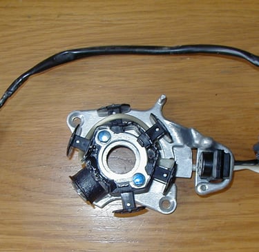 Stator before modificationRemove the Stator from the trigger coil frame. In order to do a good job winding the stator you will have to remove it from its frame. The stator has wiring connected to the solder terminals. There is a black wire with a red stripe connecting the stator to the wiring harness. Carefully unsolder this wire from the terminal on the stator. Remove the 2 bolts that hold the stator to the frame. This will free the stator from the trigger coil frame assy.