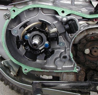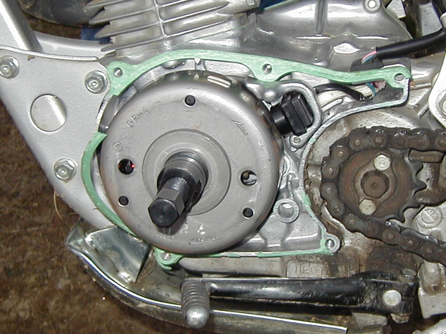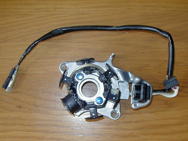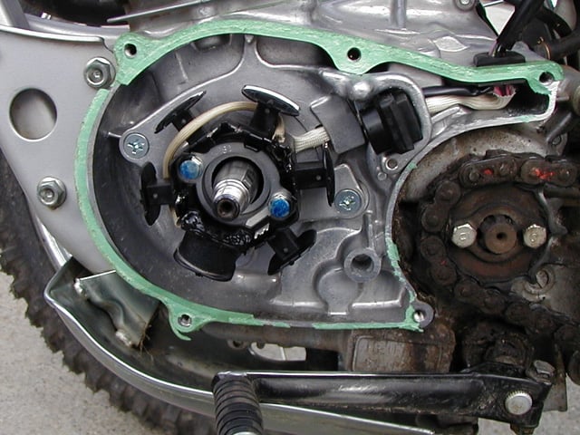 Stator before modificationFollow the wire harness up the frame and un plug it. There are only 2 wires. Carefully remove the harness for the clips in the frame and pull it clear of the frame.