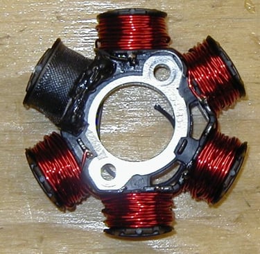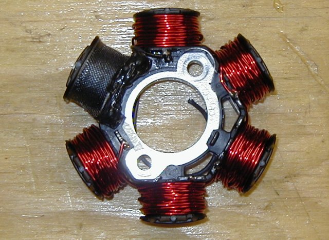 Now you have exposed the Stator Assy. You will notice that there are 5 laminated cores that do not contain coils. We will be winding our magnet wire onto these cores to "Roll our own Alternator".