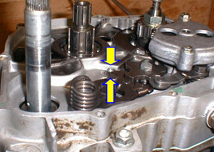 Well, after missing shifts and popping out of gear again, I bought a new shift star and shift shaft. This really did improve my shifting and confidence in my motor, but it didn't 100% fix the problem. However, sometime later at Carlsbad I broke my crankshaft in half. So one long Saturday afternoon as I was putting together the bottom end, I noticed something a little strange. The section on the right center case where the shift fork dowel goes through and butts up against the case was worn out. Very worn out!! At least by .125". This came as a shock because I never even thought about this before and I've been doing this for a while now. As soon as I noticed it, I knew this was the real reason it wouldn't shift and why it shifted before my tranny blew, but not after. You can see clearly in the picture (click on the picture) a bad it is worn out. And this is one thing to think about when buying a used motor. However, since I noticed it after my bottom end was already together, I figured I would fix it next time my motor was apart.